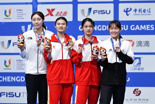 8月7日,冠军中国队韩悦(左二)、亚军韩国队金佳览(左一)、季军中国台北队许玟琪(右一)和中国队张艺曼在颁奖仪式上合影。新华社记者 晋美多吉 摄
