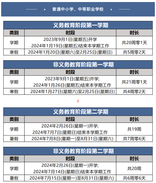 第一学期:中小学统一于2023年9月1日开学,2024年1月19日结束。寒假从2024年1月22日开始,2月18日结束。