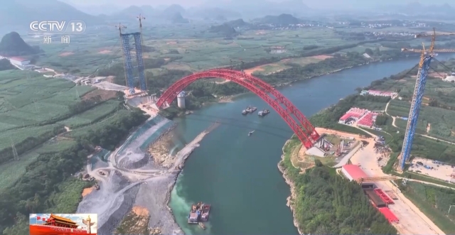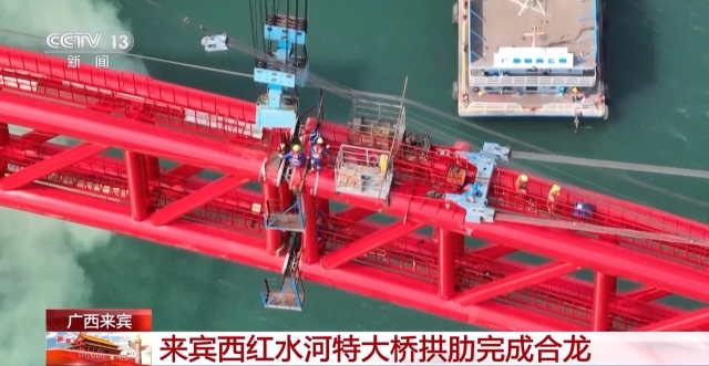 今天(1日),广西来宾西红水河特大桥拱肋顺利合龙,这标志着项目建设取得突破性进展,为下一步桥面铺装等工作打下坚实基础。