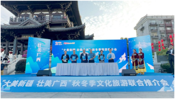 当天下午“大美新疆 壮美广西——秋冬文化旅游联合推介会”在桂林市逍遥楼举行。新疆维吾尔自治区文旅厅领导致辞,以“新疆是个好地方”为主题做了新疆冬季旅游专场推介。新疆各地州市文化和旅游主管部门领导针对当地冬季旅游资源做专项推介。新疆与广西两地旅游协会、两地多家旅游企业进行合作签约。