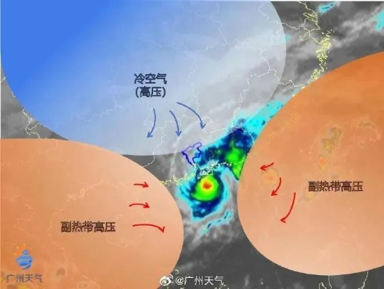 台风“小犬”在我国近海时周围的形势场 图/广州天气