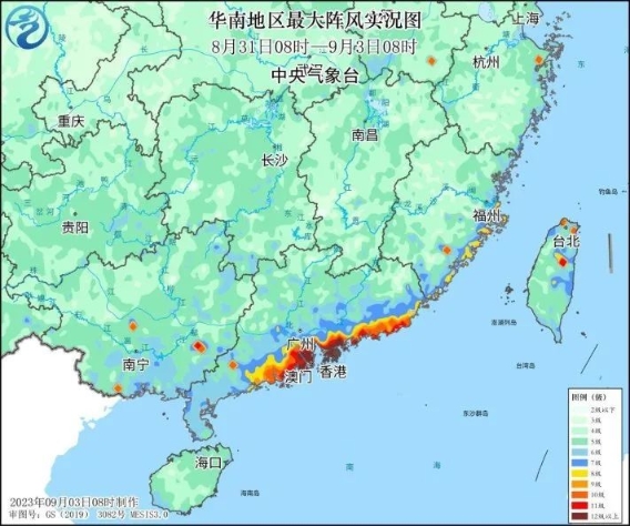 台风“苏拉”影响华南期间最大阵风实况图(8月31日8时至9月3日8时)