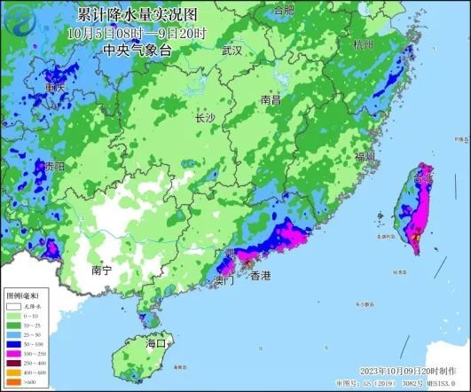 台风“小犬”影响华南期间降水量实况图(10月5日8时至9日20时)