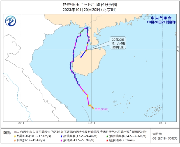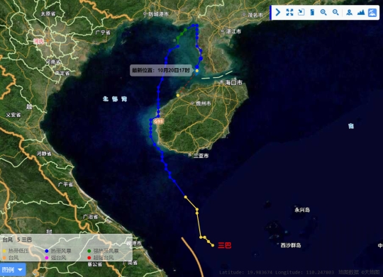 中国气象局 10月20日19时40分前后,今年第16号台风“三巴”(热带风暴级)减弱后的热带低压的中心在海南省临高县沿海登陆,而此前,台风“三巴”已先后在海南省东方市和广东省遂溪县沿海登陆。