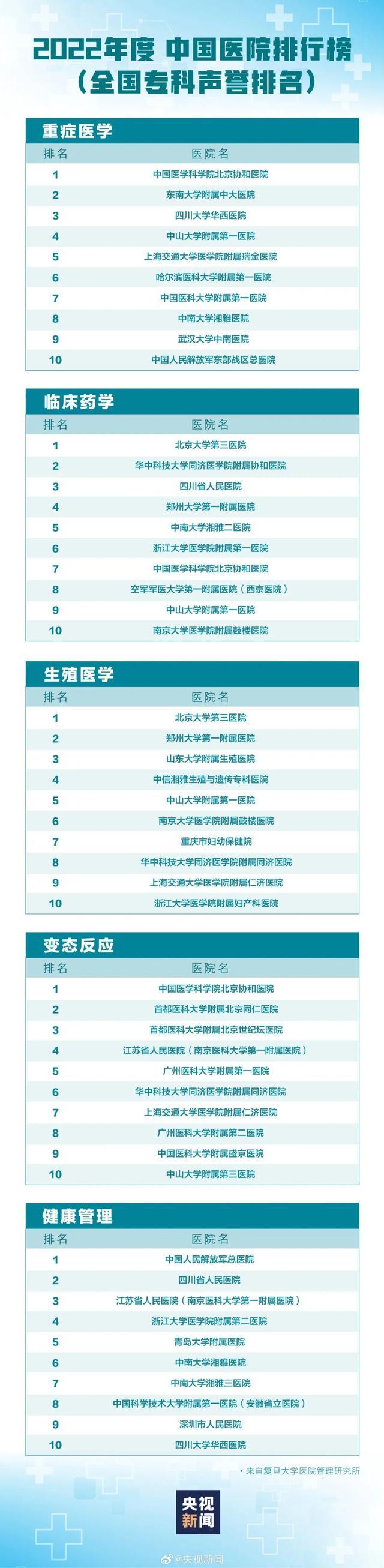 复旦版《2022年度中国医院专科声誉排行榜》