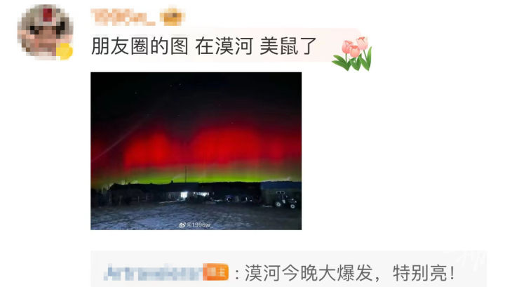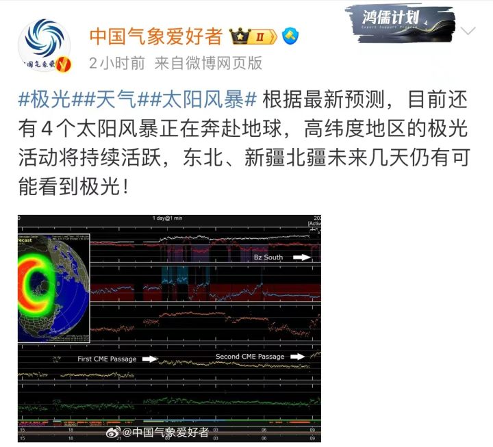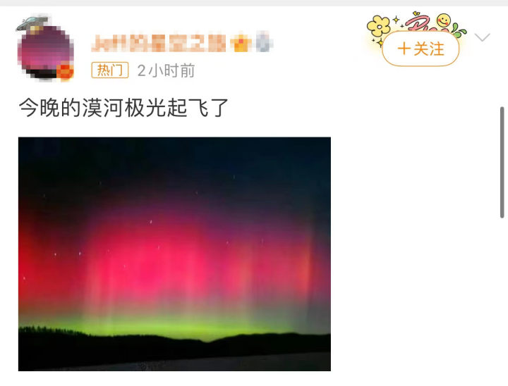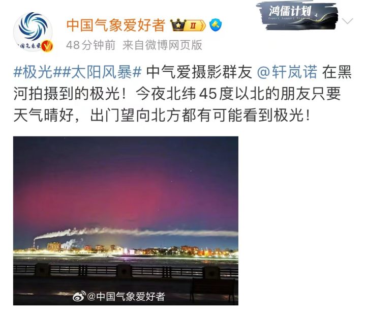 热门科学科普博主“中国气象爱好者”说:“12月1日夜晚,北纬45度以北的朋友只要天气晴好,出门望向北方都有可能看到极光”;“根据最新预测,目前还有4个太阳风暴正在奔赴地球,高纬度地区的极光活动将持续活跃,东北、新疆北疆未来几天仍有可能看到极光。”