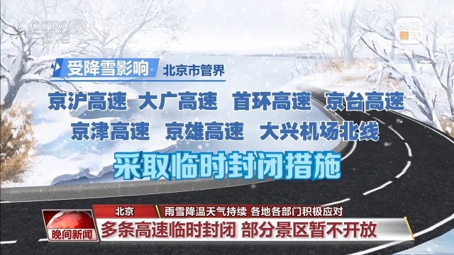 受降雪影响,北京市管界京沪高速、大广高速、首环高速、京台高速、京津高速、京雄高速、大兴机场北线,采取临时封闭措施。此外,部分公园和景区也临时关闭。包括香山公园、国家植物园樱桃沟及周边山林区域、紫竹院公园儿童游乐场等,开放时间将视天气情况而定。