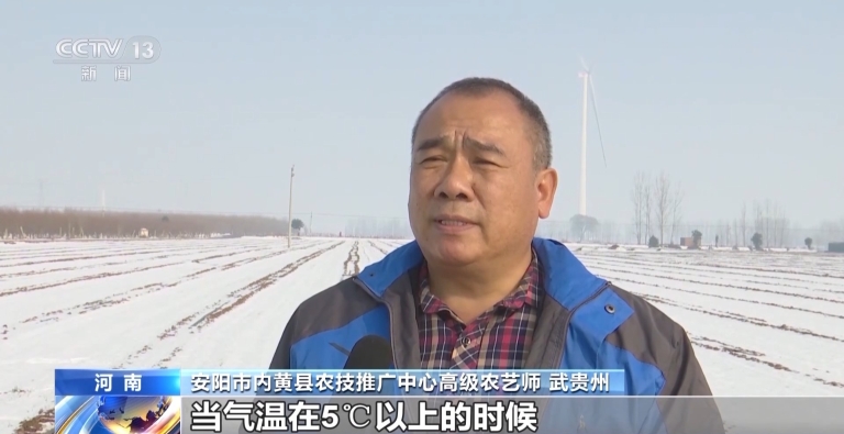 在安阳市内黄县,大雪覆盖整个麦田。农技人员与种粮大户用尖铲划开雪层。仔细查看降雪厚度和麦苗长势。据农技人员介绍,内黄县91万亩小麦,目前整体呈现出苗齐、苗壮的良好态势。同时,农技人员提醒,雨雪低温过后冬小麦将提前进入越冬期,长势偏旺和苗情偏弱的田块,受冻风险将进一步增高,提示农户及时采取防寒防冻措施。