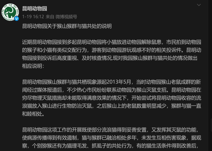 1月19日,昆明动物园官方微博发布了一则情况说明,称猴猫共处,称该现象起源于2013年5月,把猫放入猴山是为了灭鼠,猴群与猫一直和谐相处,不存在虐待行为。