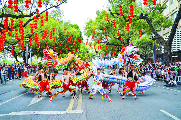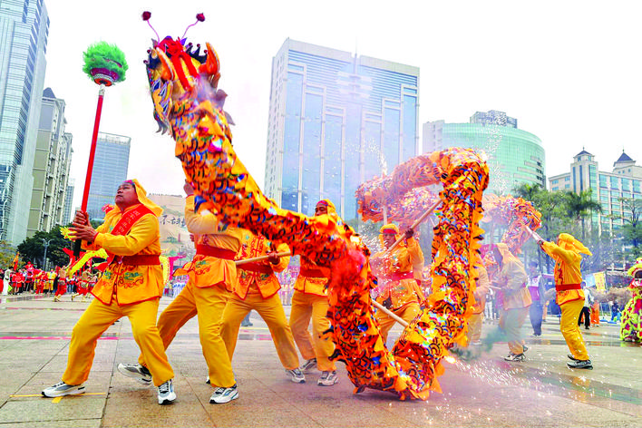 2月24日,龙舞大巡游活动现场的舞龙表演。