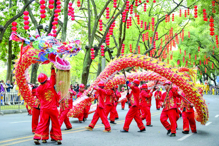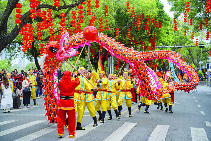 2月24日,这是巡游中的浙江长兴百叶龙舞。