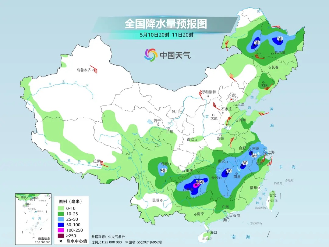 预计今天夜间到12日,西南地区东部、江南、华南等地部分地区有大雨或暴雨、局地大暴雨,累积降水量30-80毫米,局地100-150毫米。南方这轮降雨仍将以对流性降水为主,贵州、湖南、江西、湖北等地的部分地区会伴有短时强降水,最大小时降水量30-60毫米,局地超70毫米,注意防范强对流天气。