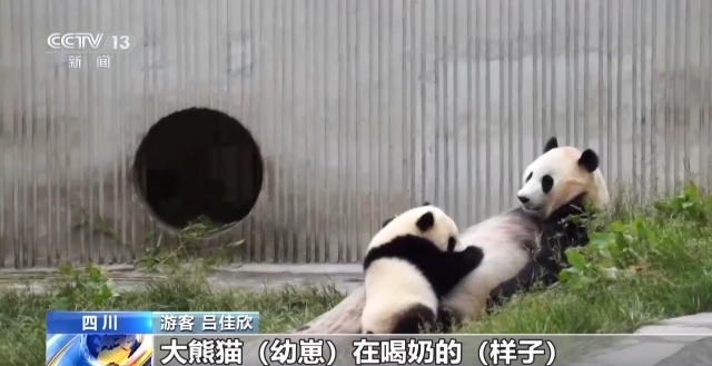 游客 吕佳欣:刚刚我们有拍到它们一家,大熊猫幼崽在喝奶的样子。特别可爱,我很喜欢。