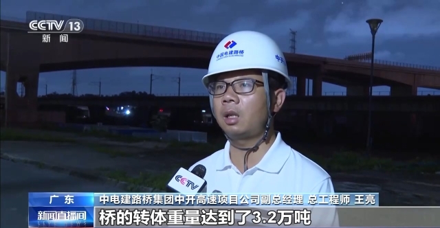 中电建路桥集团中开高速项目公司副总经理 总工程师 王亮:桥的转体重量达到了3.2万吨,是目前广东省单体转体重量最大的一个转体桥。