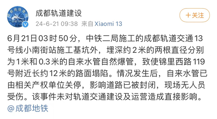 21日9时40分许,微博账号@成都轨道建设发布情况说明称,6月21日03时50分,中铁二局施工的成都轨道交通13号线小南街站施工基坑外,埋深约2米的两根直径分别为1米和0.3米的自来水管自然爆管,致使锦里西路119号附近长约12米的路面塌陷。情况发生后,自来水管已由相关产权单位关停,影响道路已被封闭,现场无人员受伤。该事件未对轨道交通建设及运营造成直接影响。