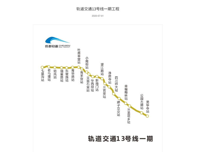 据国家发改委官网,成都地铁13号线一期工程于2019年6月17日正式获批。此外,据成都地铁微信公众号消息,同年11月11日,成都地铁13号线一期工程正式开工建设。成都地铁13号线全线西起温江区明光站,途经温江区、青羊区、武侯区、锦江区、龙泉驿区,最终到达龙泉驿区龙安站。一期工程全长29.07千米,共设21座地下车站,预计2025年开通初期运营。