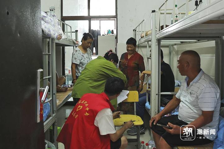 7月9日,志愿者和工作人员在安置点为被安置居民进行登记。