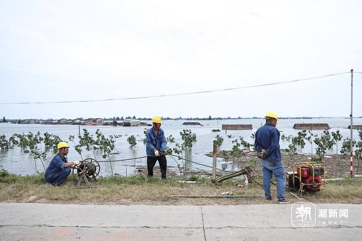 7月9日,电力部门工作人员紧急安置电线,准备开始排涝工作。