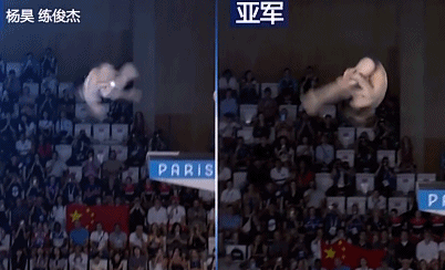 我们把动作放慢,对冠亚军选手动作作对比,不难发现,在空中转体翻腾动作和入水水花上,中国的两位选手明显更胜一筹。