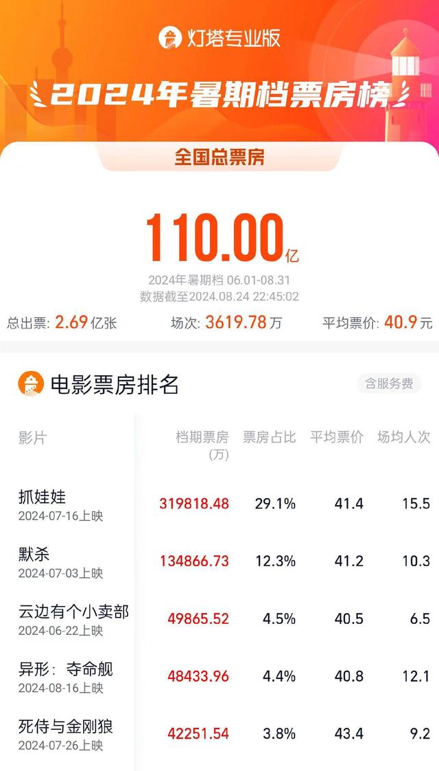 据网络平台实时数据,截至8月24日22时45分,2024年暑期档(6月—8月)档期总票房(含预售)突破110亿!当前档期票房榜前5位为《抓娃娃》《默杀》《云边有个小卖部》《异形:夺命舰》《死侍与金刚狼》。