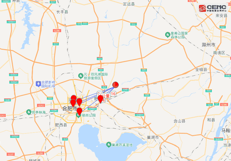周边县城:震中距肥东县16公里、距瑶海区31公里、距包河区34公里、距庐阳区34公里、距蜀山区35公里,距合肥市37公里。