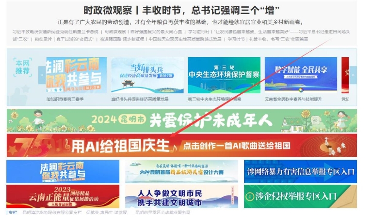 方式二,进入昆明信息港首页,点击“用AI给祖国庆生 点击创作一首AI歌曲送给祖国”图片,进入创作模式。