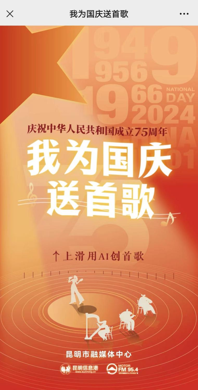 昆明信息港讯 为庆祝新中国成立75周年,昆明市融媒体中心昆明信息港和FM95.4汽车音乐广播联合推出“庆祝新中国成立75周年——我为国庆送首歌”主题活动。网友和听友可以通过昆明信息港平台,在线生成AI歌曲,用AI的方式给祖国庆生。