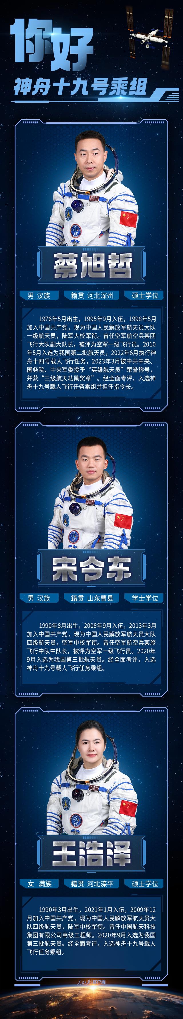 执行神舟十九号载人飞行任务的航天员乘组由蔡旭哲、宋令东、王浩泽3名航天员组成,蔡旭哲担任指令长。