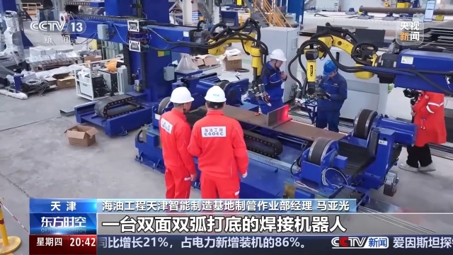 海油工程天津智能制造基地制管作业部经理 马亚光:这是我们自主研制的一台双面双弧打底的焊接机器人,通过采用激光跟踪可以自动识别管件和坡口尺寸,加工精度可以控制在2毫米以内。