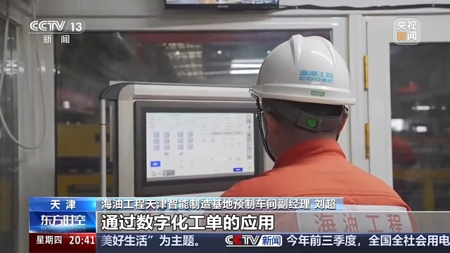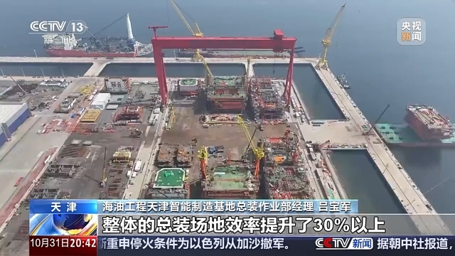 海油工程天津智能制造基地总装作业部经理 吕宝军:相较于传统的建造模式,并且有智能化信息化的优势和赋能,整体的总装场地效率提升了30%以上。