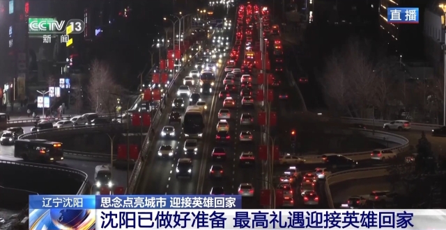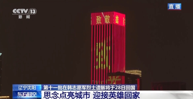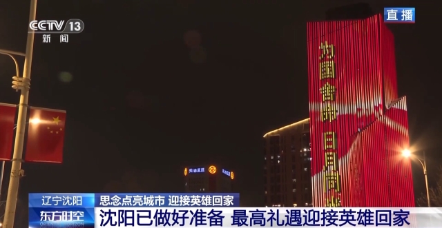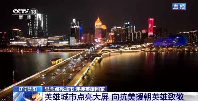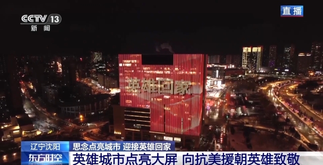 总台记者 贾铁生:沈阳这座英雄城市,这两天提前点亮了全城主要街道的大屏幕,向英雄致敬,迎接第十一批在韩中国人民志愿军烈士遗骸回家。