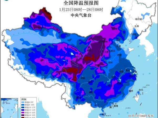 在寒潮影响下,各地气温明显下降。中央气象台今晨6时发布今年首个寒潮蓝色预警,预计,23日至27日,我国大部气温将先后下降8至12℃,西北地区东部、华北西部等地降温幅度可达14℃以上,上述地区伴有4至6级偏北风,阵风7至9级。28日早晨,最低气温0℃线将南压至云南北部至江南南部一带。