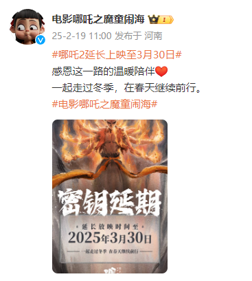 2月19日消息,电影《哪吒之魔童闹海》(即哪吒2)延长上映至3月30日。