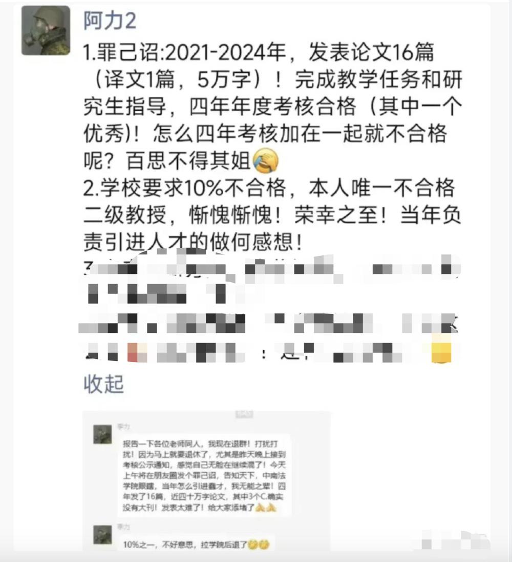 疑为“李力”另一ID的“阿力2”在朋友圈发“罪己诏”感叹:“我自认无能。2021-2024年,发表论文16篇(译文1篇,5万字)!完成教学任务和研究生指导,四年考核都合格,还有一年优秀,怎么合到一起就不合格了呢?学校要求10%不合格,本人唯一不合格二级教授,惭愧惭愧!荣幸之至!当年负责引进人才的做何感想!”
