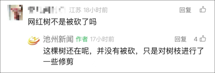 池州经开区管委会表示,树已暂时保留,目前只砍了部分树枝,相关协商工作正在进行中。
