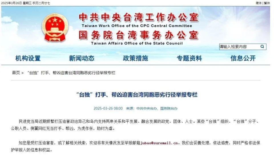 国务院台办政府网站此前已经推出“‘台独’打手、帮凶迫害台湾同胞恶劣行径举报专栏”,对恶劣行径和首恶分子进行追责。受打压迫害者,或了解相关线索的人士,欢迎将有关情况发至举报邮箱jubao@suremail.cn。有关部门会妥善处理,择期曝光,对证据确凿、性质恶劣的犯罪分子依法追责,同时严格依法保护举报人的信息和权益。