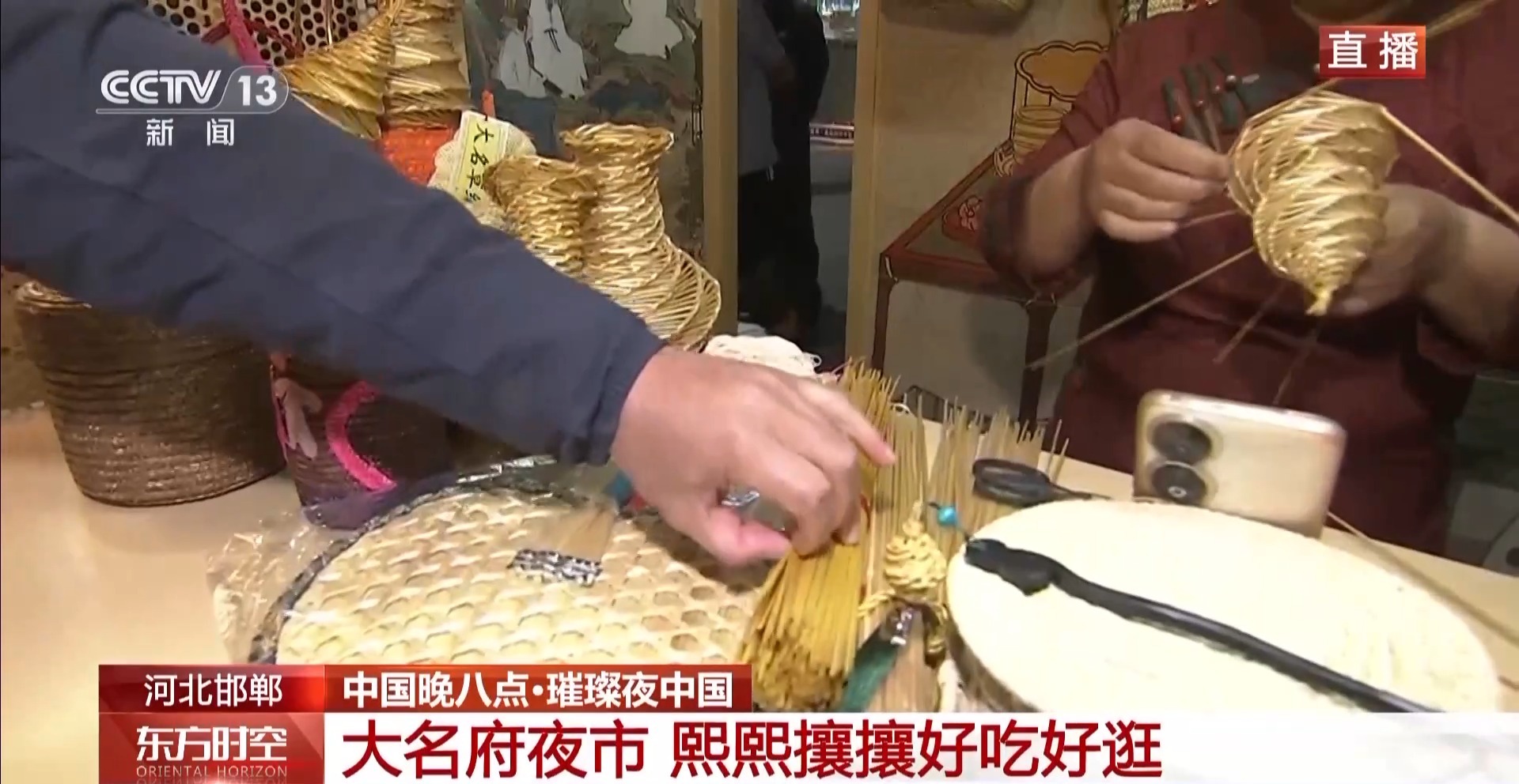 你看在这里有“大名草编”,它的制作技艺是国家级非物质文化遗产,普通的麦秸秆在非遗传承人手中,能编成包、编成帽,还有很多的艺术品。