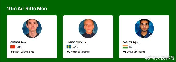 国际射联更新世界排名,盛李豪在10米气步枪项目上以10000积分,领先第二名瑞典选手维克多(5663分)近一半积分,断崖世界第一!