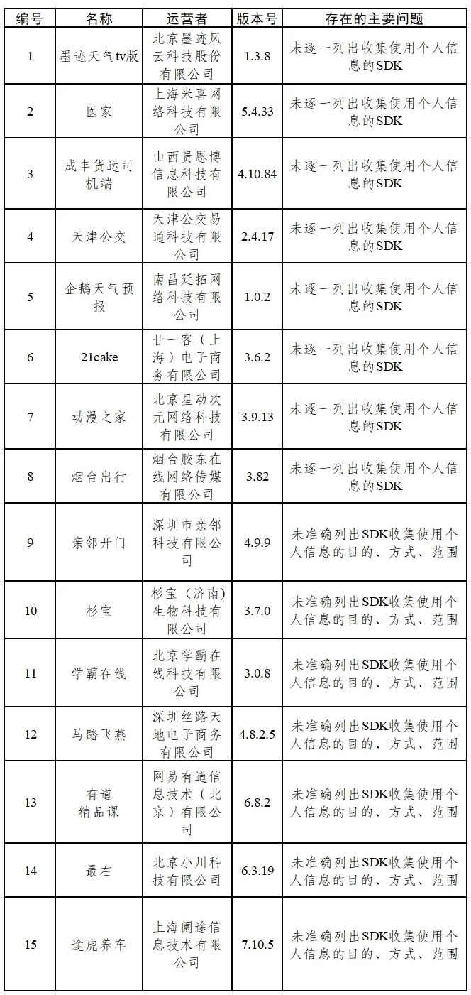 一、墨迹天气tv版、医家等15款App存在未逐一列出收集使用个人信息的SDK,未准确列出SDK收集使用个人信息的目的、方式、范围等问题(详见下表)。
