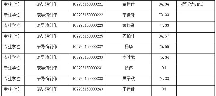 名单显示金世佳报考的是表导演创作专业学位,业务一科目成绩为94.34分,黄晓明报考的则是艺术管理/戏剧策划的专业学位,业务一科目成绩为89分。
