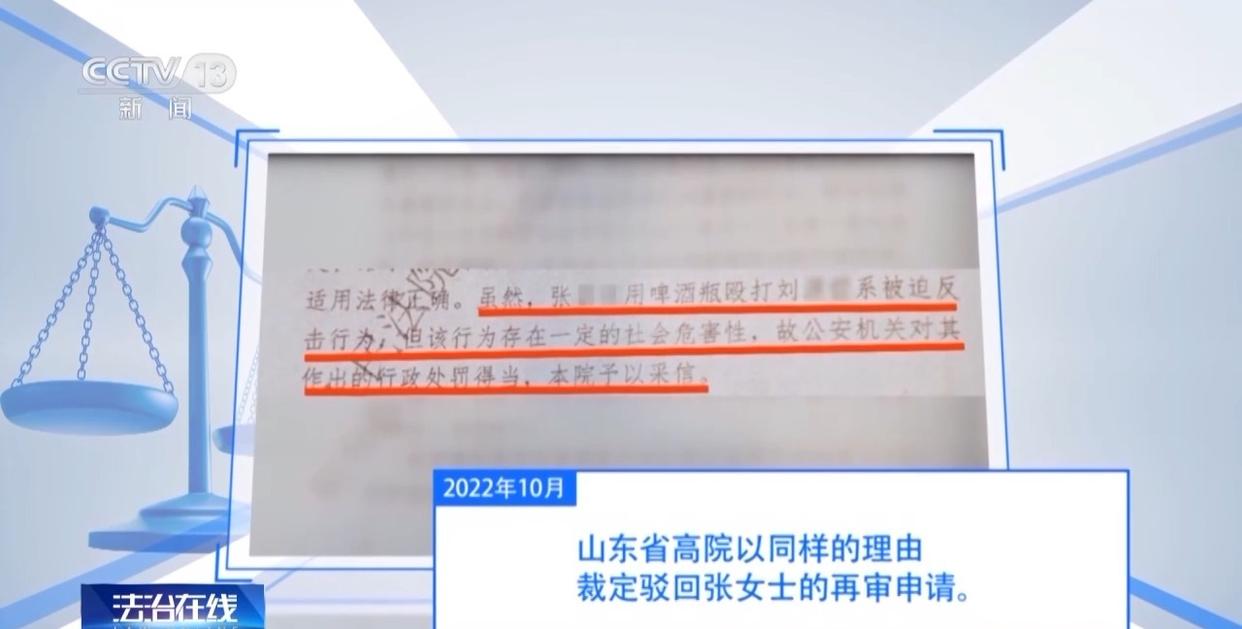 2022年3月,二审法院作出判决,驳回上诉,维持原判。两审法院都认为,虽然张女士用啤酒瓶殴打刘某系被迫反击行为,但该行为存在一定社会危害性,故公安机关对其作出的行政处罚得当。对此,张女士仍不服,继续向山东省高级人民法院申请再审。