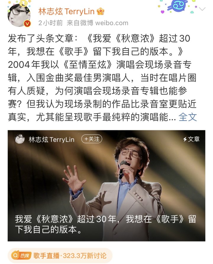 5月23日晚,林志炫还通过个人微博发表了长文,称自己这次选择唱《秋意浓》,是因为“我爱《秋意浓》已经超过30年,所以这次想在《歌手》留下我自己的版本”。