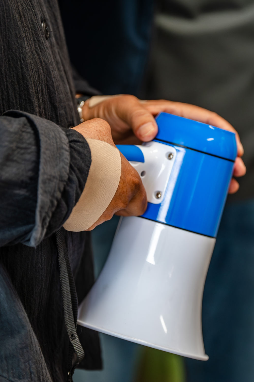 5月27日,张桂梅贴满膏药的双手握着小喇叭。新华社记者 胡超 摄