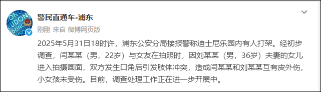 刚刚,@警民直通车-浦东 发布微博:2025年5月31日18时许,浦东公安分局接报警称迪士尼乐园内有人打架。经初步调查,闫某某(男,22岁)与女友在拍照时,因刘某某(男,36岁)夫妻的女儿进入拍摄画面,双方发生口角后引发肢体冲突,造成闫某某和刘某某互有皮外伤,小女孩未受伤。目前,调查处理工作正在进一步开展中。
