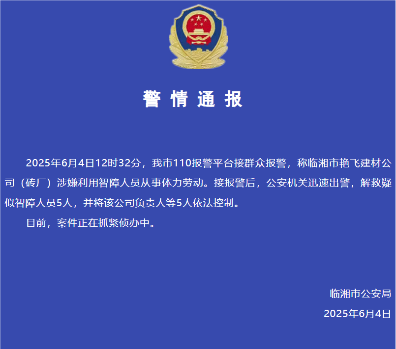 2025年6月4日12时32分,我市110报警平台接群众报警,称临湘市艳飞建材公司(砖厂)涉嫌利用智障人员从事体力劳动。接报警后,公安机关迅速出警,解救疑似智障人员5人,并将该公司负责人等5人依法控制。