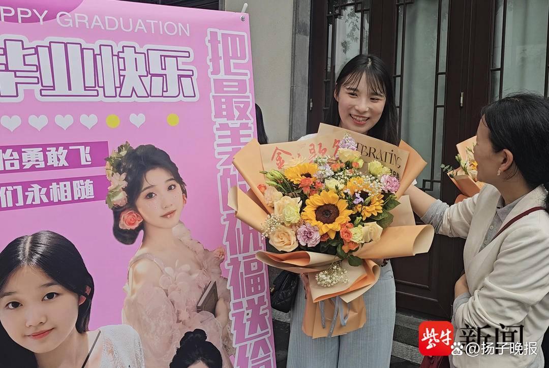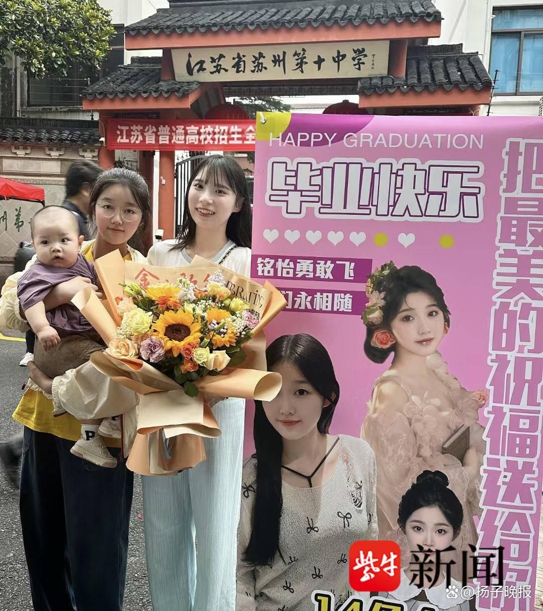 晚上6点,记者来到苏州第十中学考点看到,尽管距离考试结束还有15分钟,校门口的小巷子里已经围满了手捧鲜花、迎接考生的家长们。其中,一张彩色易拉宝海报格外显眼,海报上写着“把最美的祝福送给你——毕业快乐!铭怡勇敢飞,我们永相随。”该考生的妈妈告诉记者,易拉宝海报是孩子姐姐专门为她设计、制作的。