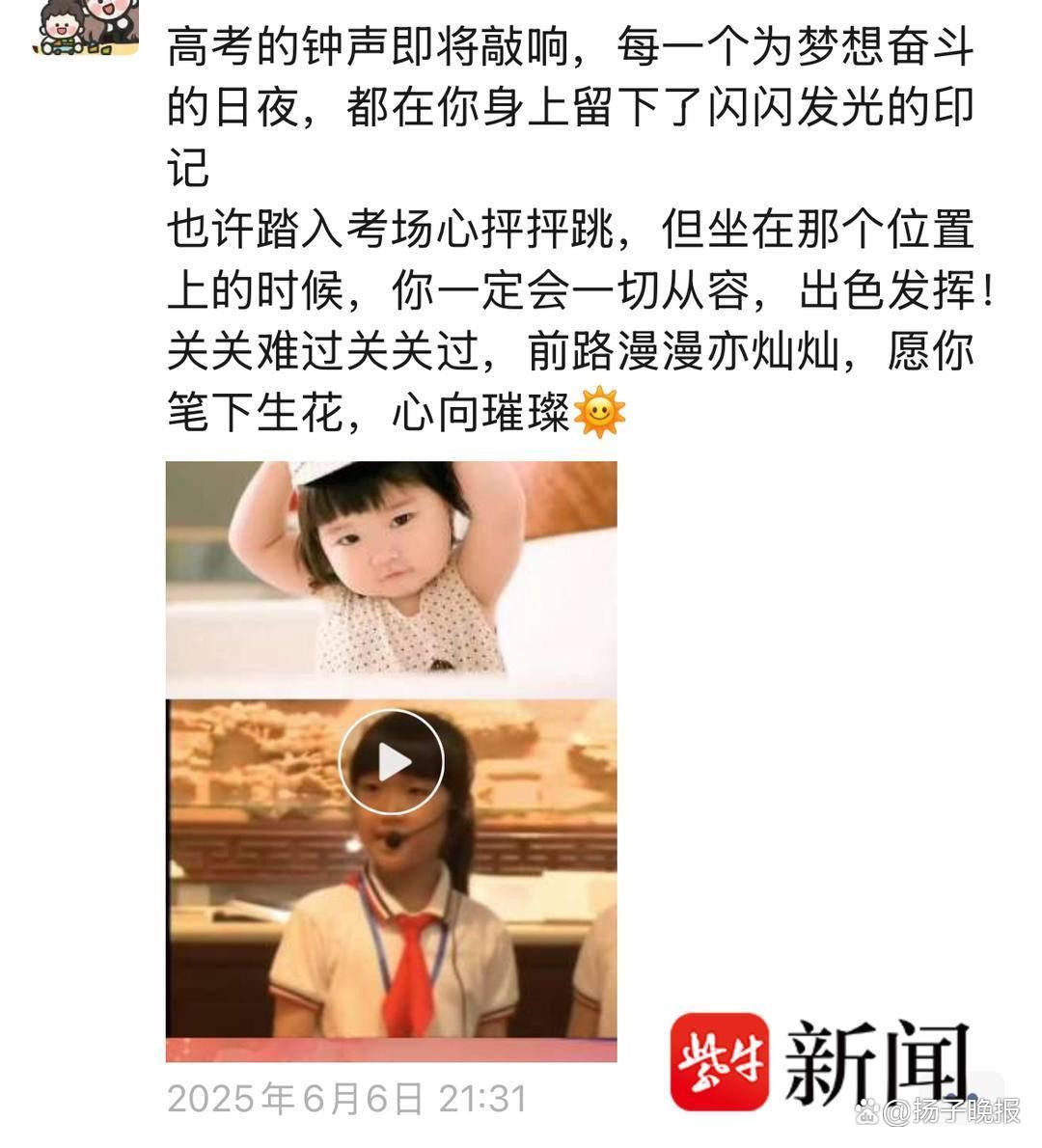 在这次妹妹高考的前一天,姐姐还用妹妹从小到大的重要成长照片制作成了一个祝福视频,并发朋友圈写道:“高考的钟声即将敲响,每一个为梦想奋斗的日夜,都在你身上留下了闪闪发光的印记……你一定会一切从容、出色发挥!愿你笔下生花,心向璀璨!”