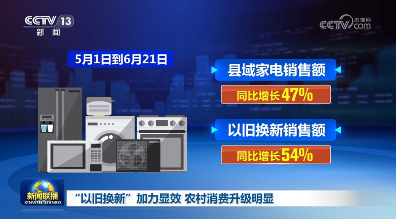 央视网消息(新闻联播):眼下,全国县域家电市场迎来了年中的销售高峰。在“以旧换新”政策的推动下,农村市场活力进一步迸发,消费升级趋势明显。
