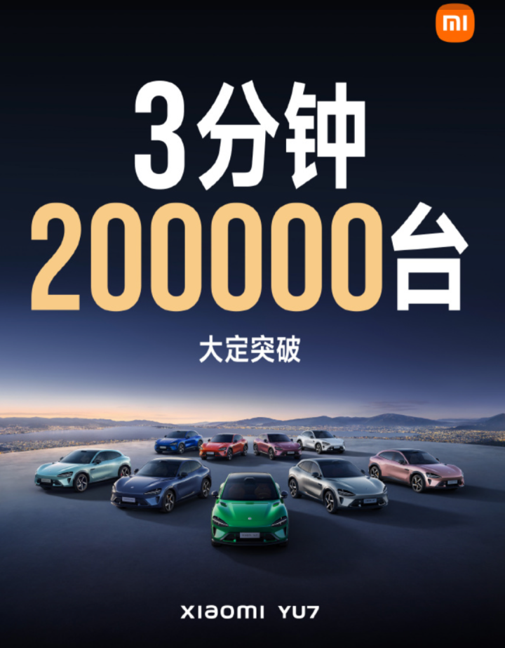 据小米汽车官微最新消息,3分钟,小米YU7大定突破200000台。