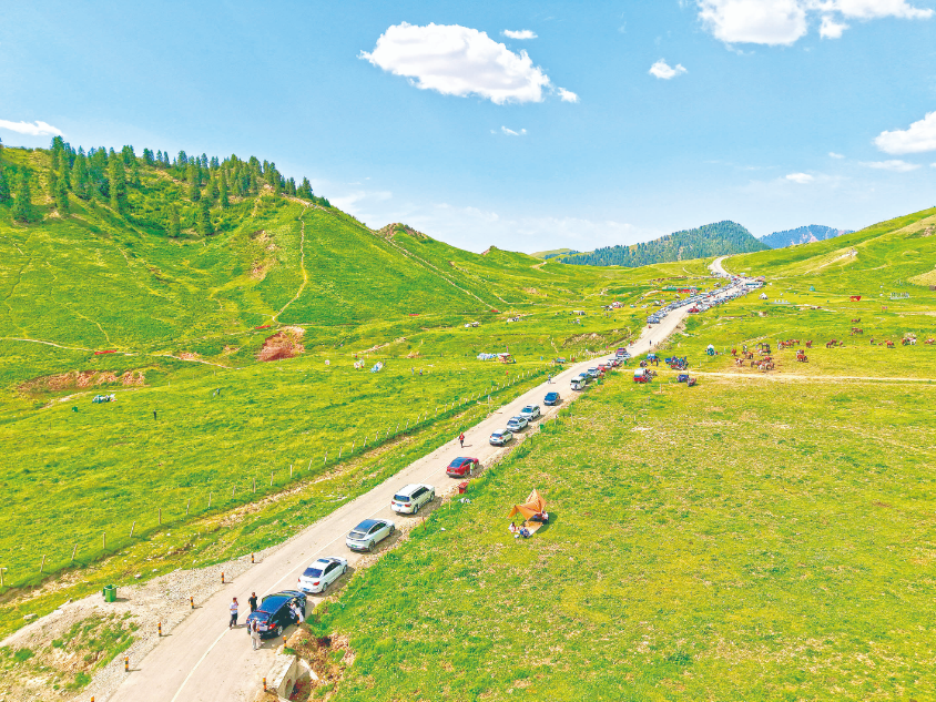 6月29日,游客在天山托木尔景区游玩。 通讯员 艾则孜·沙木沙克 摄